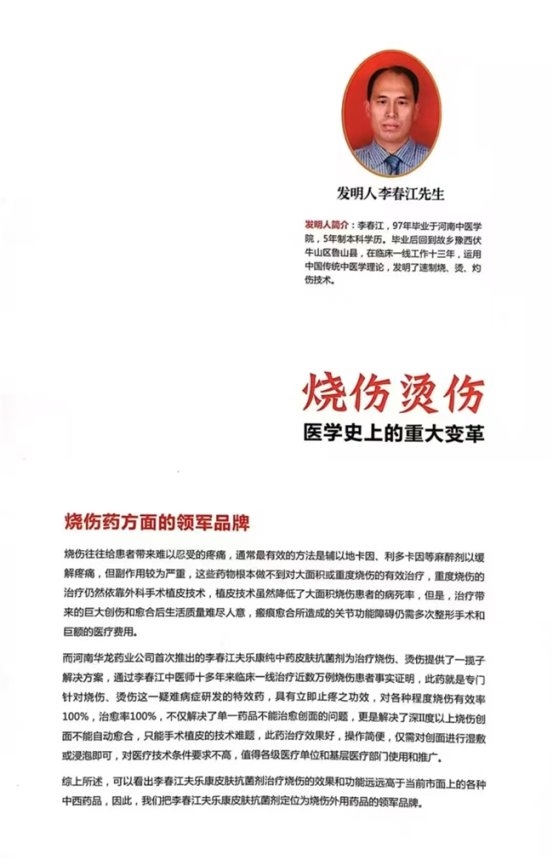 李春江的烧伤药成果,不仅在临床疗效上取得突破,更在产品转化方面迈出了坚实步伐。他参与研发的“李春江夫乐康抗菌喷剂”,由河南华龙药业生产,适用于烧伤、烫伤等创面抗菌护理,凭借“瞬间止痛、不留疤痕、使用简便、自动愈合”的特点,成为许多烧伤患者的首选。他以“仁和堂李春江中医师”的身份开展诊疗工作,将烧伤药与中医针灸、推拿等疗法相结合,为患者提供全方位的医疗服务。在他看来,中医药的优势在于整体调理、标本兼治,烧伤治疗不仅要愈合创面,还要兼顾患者的整体健康。如今,他的诊疗工作室每天都有患者前来咨询,他始终以饱满的热情投入工作,用专业的医术为患者带来希望。